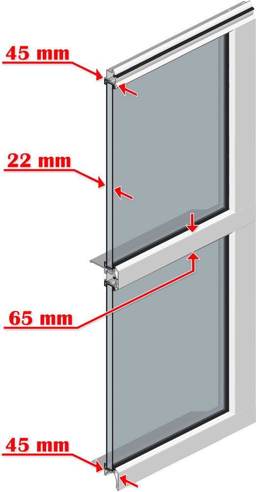 Полотно ворот целиком состоит из панорамных панелей, имеющих одинаковую ширину и высоту. В панорамных воротах AluLineиспользуются панели с двойным остеклением, при этом толщина стеклопакета составляет 22 мм.
