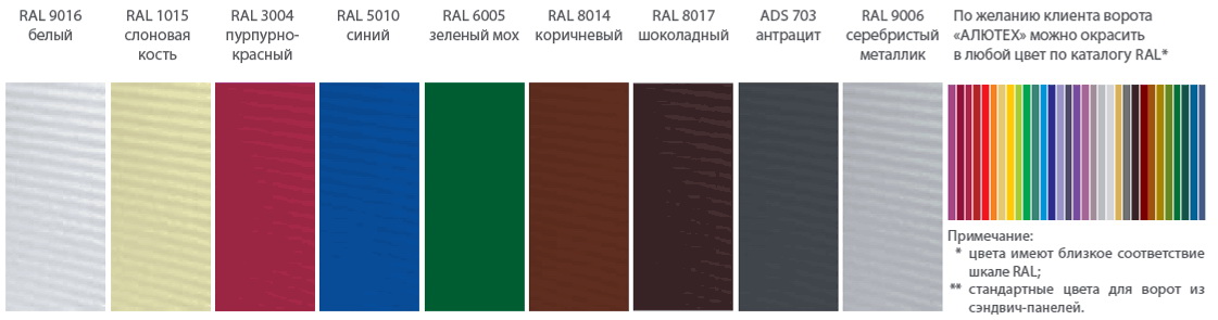 Возможность окраски ворот «Алютех» любой цвет, имеющий близкое соответствие шкале RAL позволяет добиться идеального цветового сочетания с фасадом здания.
