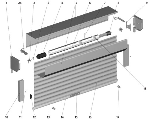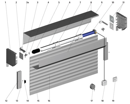 Полотно роллеты приводится в движение электроприводом (10) при помощи выключателя клавишного (18), поворотного (19), с ключом (17) или пульта дистанционного управления.