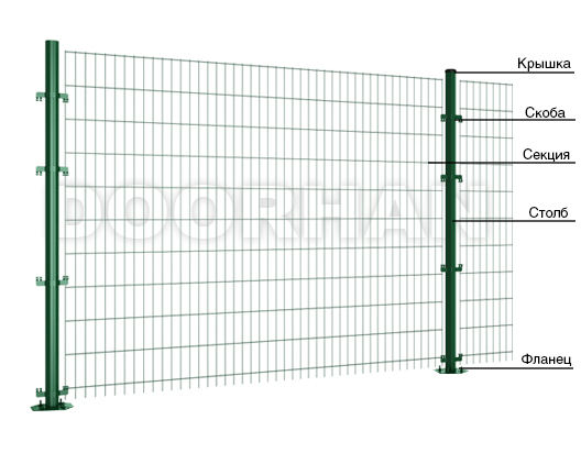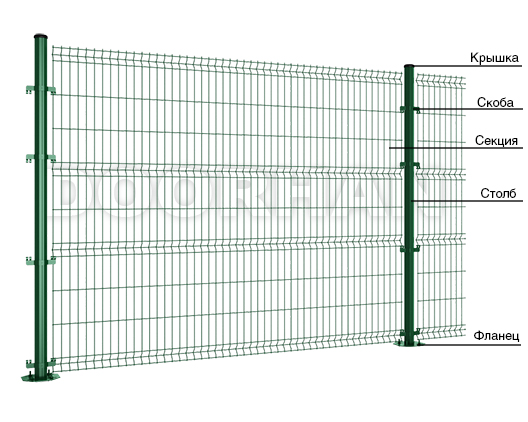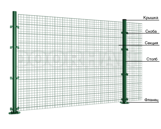 Панельные секции представляют собой сварную сетку с двойной горизонтальной проволокой. Изготавливаются на автоматической линии методом точечной сварки горячеоцинкованных стальных прутков. После сварки секции проходят цинкофосфатирование, затем окрашиваются в камере порошковой покраски. В результате всех выполненных операций на поверхности прутка образуется защитный полимерный слой, который обеспечивает секциям защитные антикоррозийные свойства в течение 10 лет.